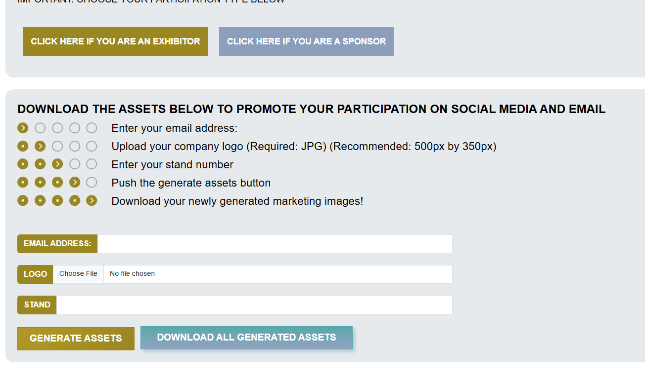 To generate assets with your logo, select whether you are an exhibitor or sponsor, then simply enter your email and logo into the prompts and click download!